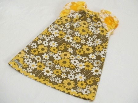 Blomstrende rynkekjole i gyldne farger, sydd av dynetrekk. Ren bomull. Strikk i hals og armer. Pyntet med en bred, gul kroklisse nederst på kjolekanten.