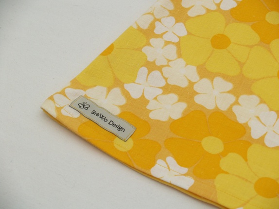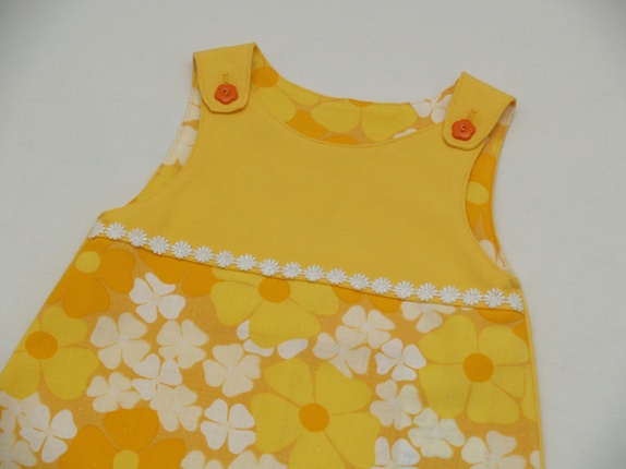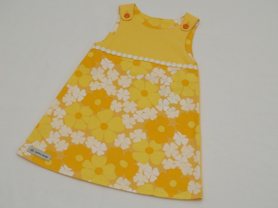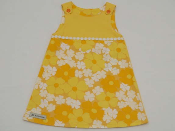 Hengslekjole med god passform som barnet kan vokse i. Sydd av et gjenbrukt dameskjørt av gult dongeristoff og et blomstrete dynetrekk. Kjolens overdel er foret med det samme stoffet som utgjør forstykkets underdel. Pyntet med et hvitt blomsterbånd over brystet og søte, orange knapper.