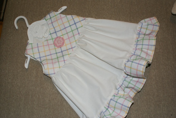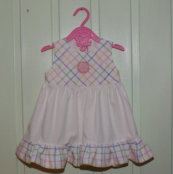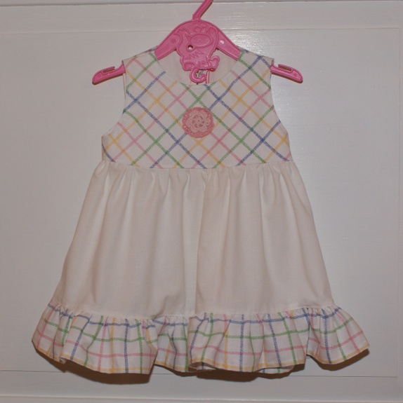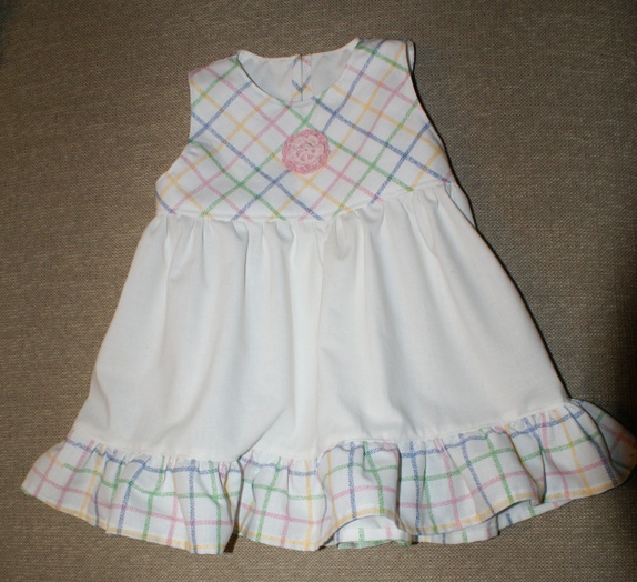 Kjole i ren bomull. Overdelen er foret. Rynkekappe nederst og rosa hekleblomst foran. Splitt i nakken som lukkes med en knapp.