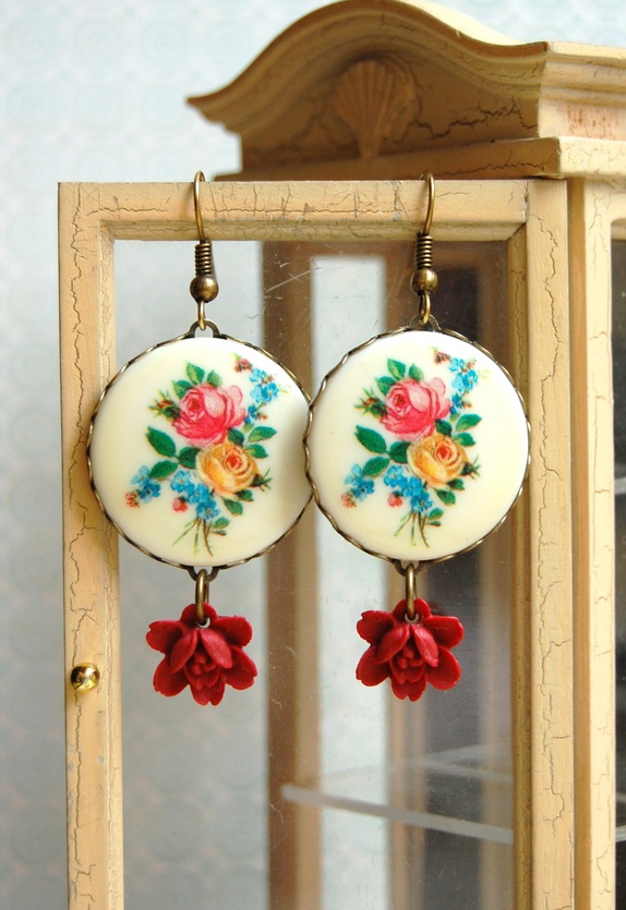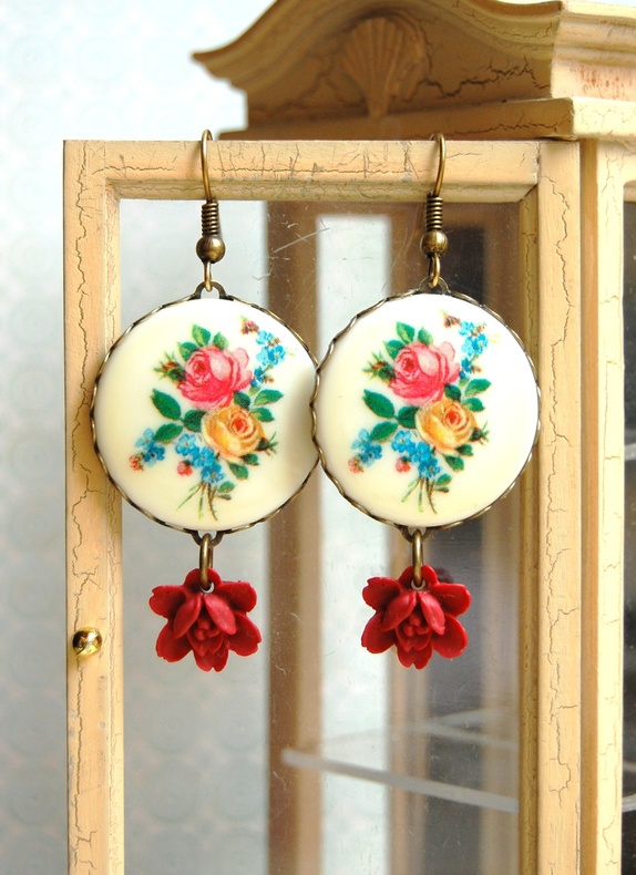 Et par nydelige øredobber av antikkgull messing og luciteplater med blomsterdekal.Under henger en liten rød luciterose.Hele øredobben er 5.6 cm lang inkl kroken.