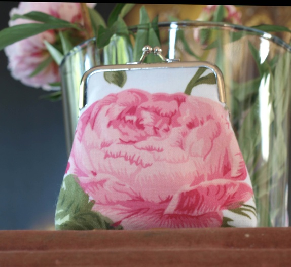 søt portemone til penger, sminke etc.sydd i rose stoffforet med samme stoffvliselin mellom lagenebredde: 12 cmhøyde: 12 cm