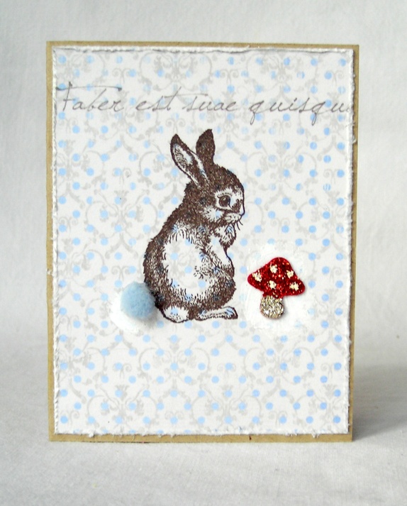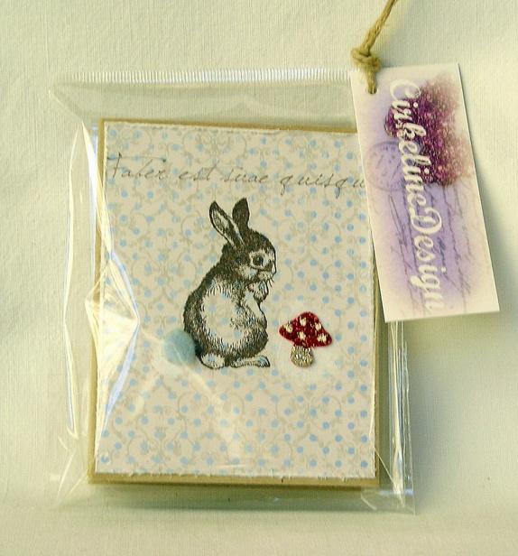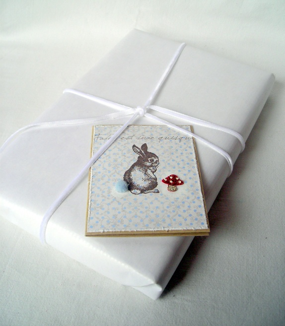 Kortene er pyntet med prikkete designpapir, et håndstemplet motiv av en sjarmerende harepus med pompong-hale og en liten fluesopp med mørk rødt og sølv glassglitter.