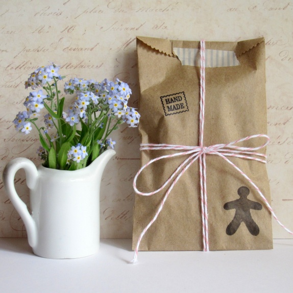 Gavelappene er pakket i en søt gavepose med seigmannstempel og bomullsbånd og kan være en fin liten vertinne- eller venninnegave.