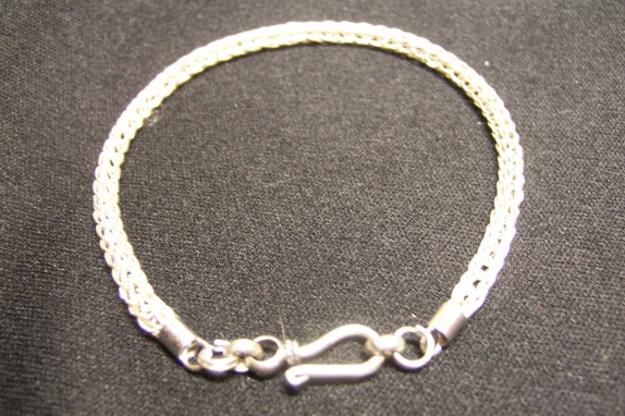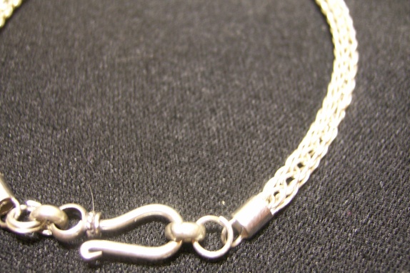 Dette er et armbånd strikket over 5 masker av 0,4mm (26 gauge) sølvtråd.