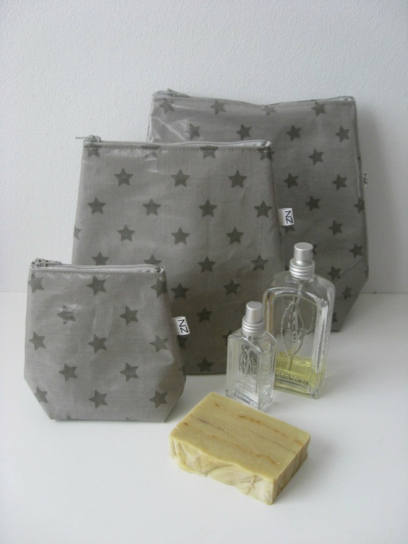 i et grått vannavstøtende materiale med stjerner i mørkere grått.