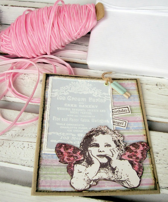 Det er dekorert med designpapir, håndstemplede motiver og en iskrem i miniatyr. Lapper med teksten "Birthday Angel" stikker frem.