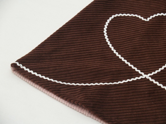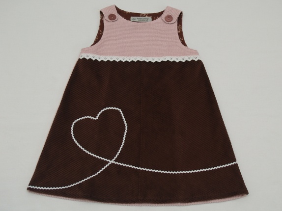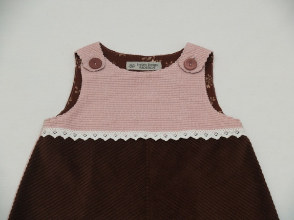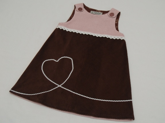 Hengslekjole i lys rosa og dyp brunt, både søt og røff. Sydd av to dameskjørt i cordfløyel. Pyntet med en hvit bomullsblonde og et hvitt bånd som er formet som et hjerte. Kjolens overdel er foret med et småblomstrete bomullsstoff kjøpt på loppemarked.