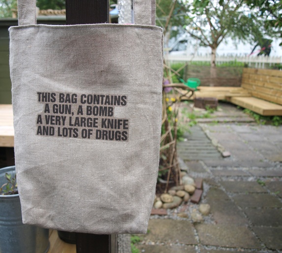 veske/nett sydd i lin med påstrøket motiv.Foret med blomstret bomullstoff.Bredde: 26 cmHøyde: 31 cmHåndtak måler 70 cm