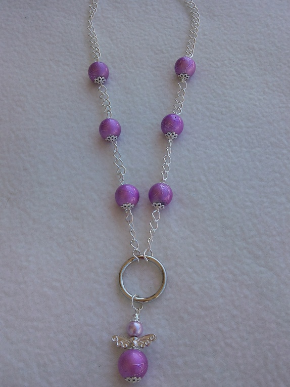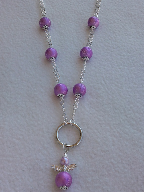 Halskjede laget av lenke og rosa flotte "glitrende" glassperler, med metalldetaljer, og engle-anheng.