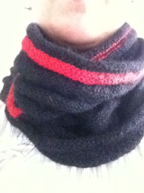 Håndstrikka hals i sort med røde striper. Kan brukes som hette og som skuldervarmer da den er litt mer elastisk i den ene enden.