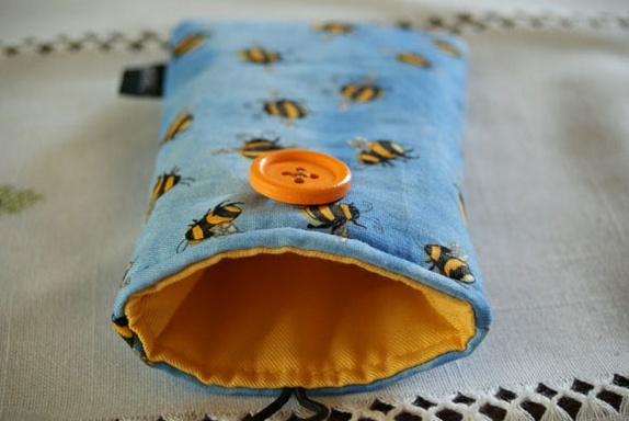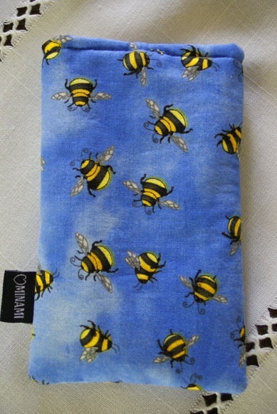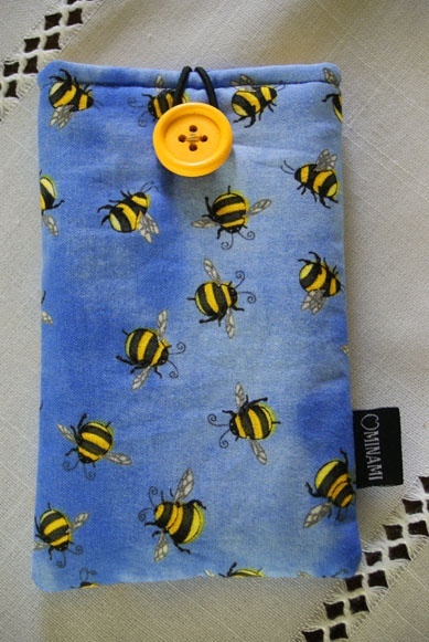 Bunnfargen til etuiet er blått med motiv av humler.