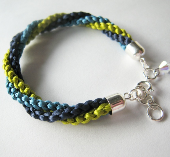Navy/grønt/turkis tvunnet armbånd i sateng - flettet for hånd
