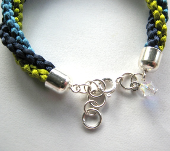 Armbånd i flettet satengsnor med endestykker, rund lås og o-ringer i forsølvet metall, swarovskikrystall ved låsen.