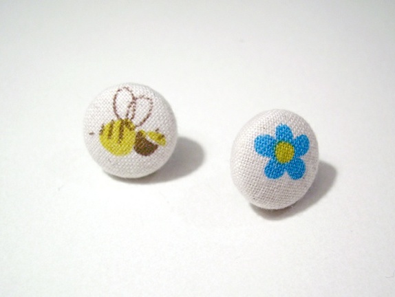 Blå blomst og bie på hver sin knapp.Bomullsstoff.Disse måler 1,6 cm i diameter. Kjempesøte!