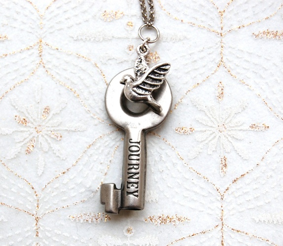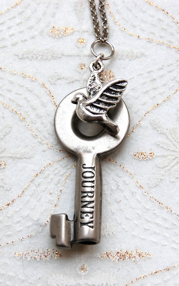 Sølvfarget langt kjede med nøkkelannheng og due. Anhenget er ca 5.8 cm langt.Lenken er ca 67 cm lang.