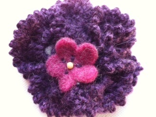 trippelhekla brosje i alpakkaull med filtblomst. Fin som pynt på sjal, men også som en liten venninnegave.