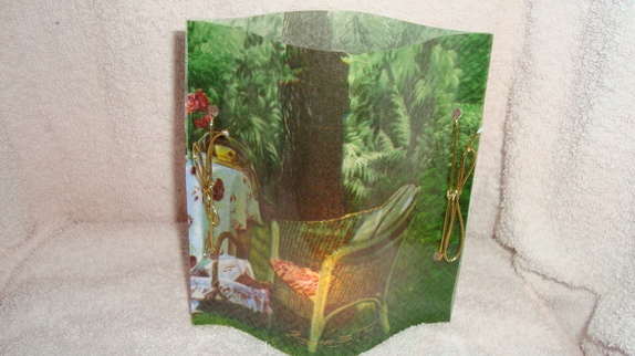 Telys skjerm med kurvstol og hagebord i det grønne.