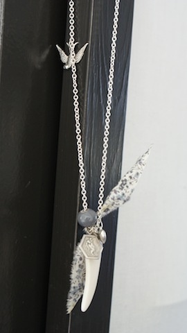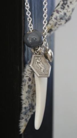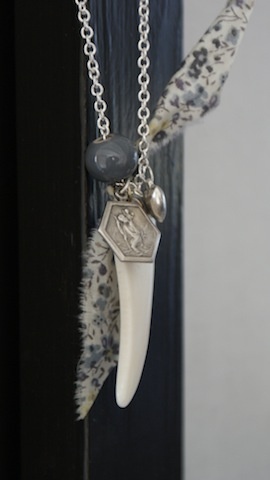 Lenken er sølv-farget, på denne henger en horn tann 1,5x4,5cm + en gammelt katolsk sekskantet anheng diameter 1,5cm + sølv hjerte + en keramikk kule 1,2 cm i diameter og en sølvfarget fugl.