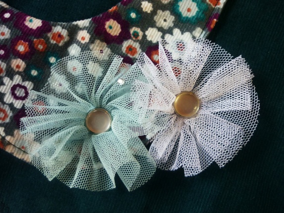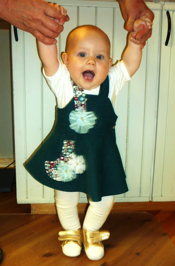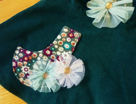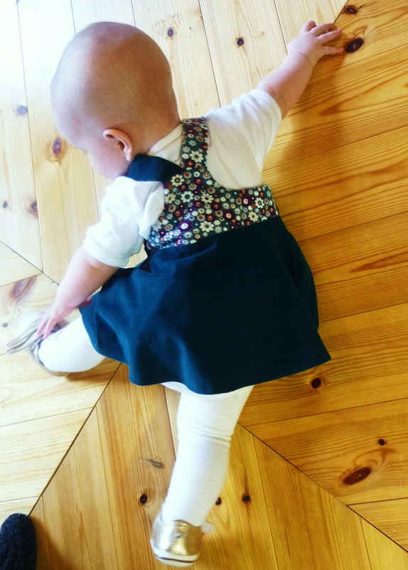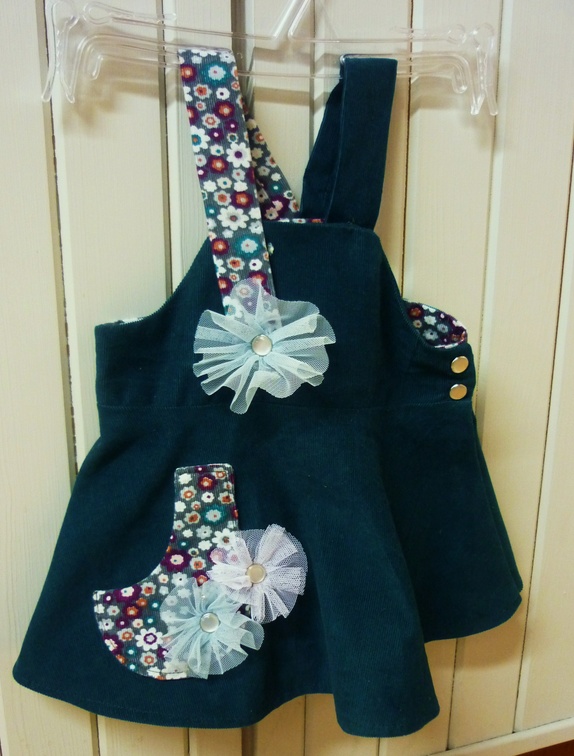 Sele-kjole i babycord med bomullsfòr og lomme.Detaljer i tyll og perlemorsknapper.