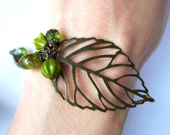 [Tags: Bladarmbånd, naturarmbånd, prenittambånd, messingarmbånd, blomsterarmbånd, grønn, grønt, glitrende, sølv, feminint, feminin, naturlig, natur, skog, filigran]