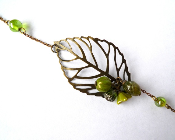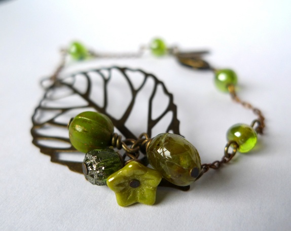 Yndig armbånd inspirert av hva sommernaturen har å by på. Satt sammen av et messingblad, diverse perler i grønntoner og et perlet vintage-kjede.