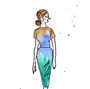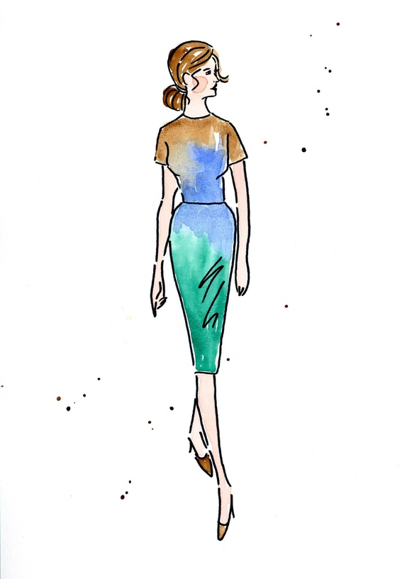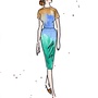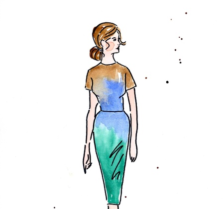 Moteillustrasjon, modell i brun, blå og grønn kjole, inspirert av illustrasjoner fra 60- og 70-tallet. Utført med akvarell og tusj på syrefritt 180 grams akvarellpapir.