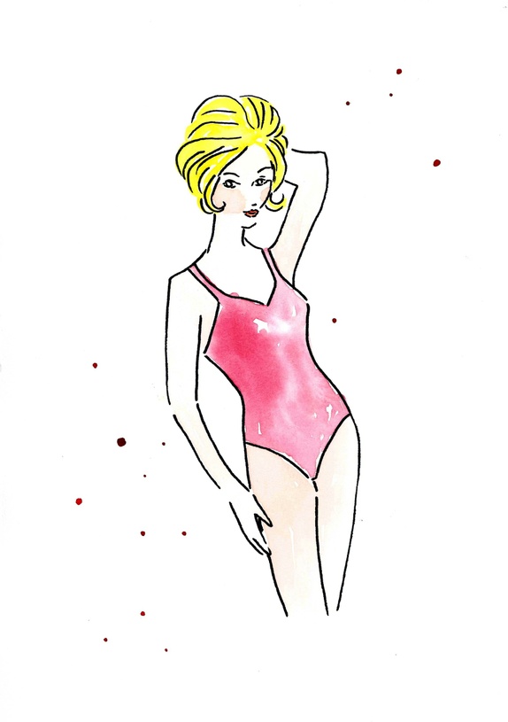 Moteillustrasjon i rosa og gult, inspirert av illustrasjoner fra 60- og 70-tallet. Utført med akvarell og tusj på syrefritt 180 grams akvarellpapir.
