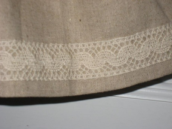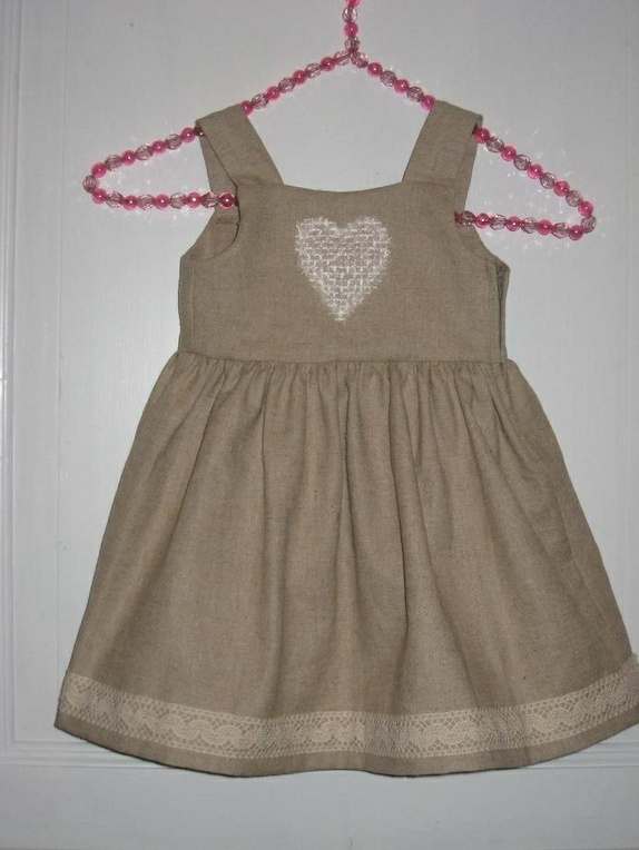 Kjolen er av 55 % Lin og 45% bomull.Pyntet med bånd nede langs kanten og med hjerte av stoff på brystet. Glidelås i siden.