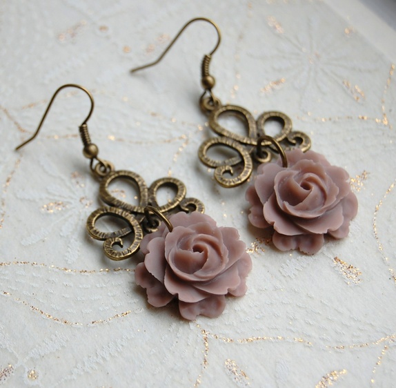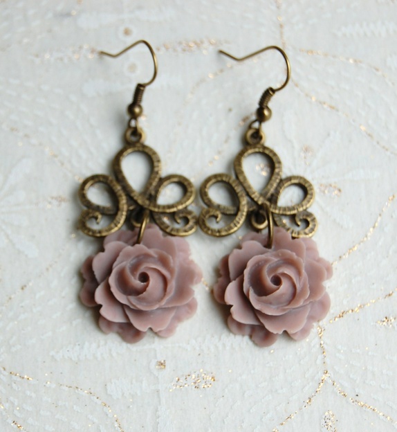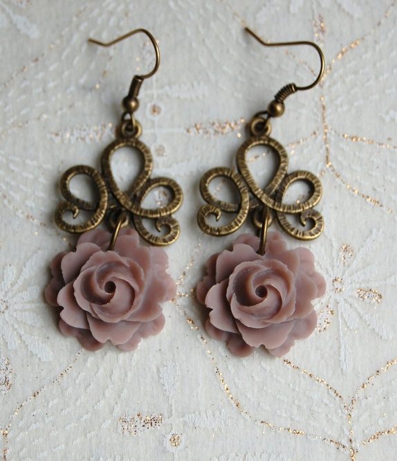 Et par øredobber av antikkgull messing og blek lavendelrosa luciteblomster.Hele øredobben er 5.7 cm lang inkl kroken.
