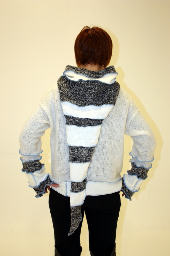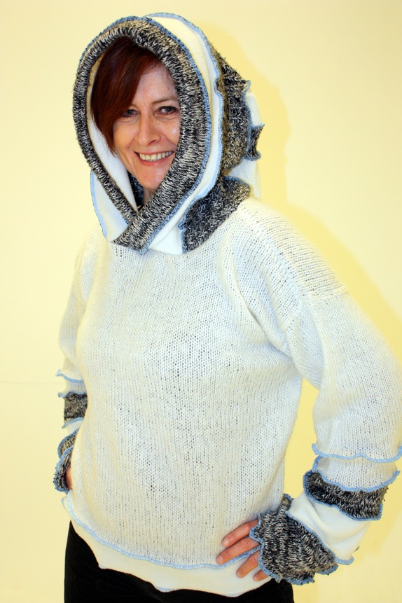 Produktene mine er laget av forskjellige type tekstiler. Jeg bruker strikka gensere og andre strikkevarer som jeg klipper opp, ullfilt og fleece. Noen ganger er det også innslag av silke, velour og sateng for ”special effects”