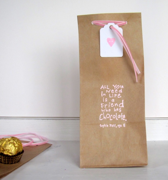 Dette settet består av fire gaveposer i str 21 x 9 x 6 cm, som er embosset (forhøyet stempling) med teksten "All you need in life is a friend who has chocolate" i knall rosa. Gaveposene har to hull øverst, og det medfølger nydelige rosa fløyelsbånd og små lapper med brun malje, rosa hjerte og "To" og "From" stemplet på baksiden.
