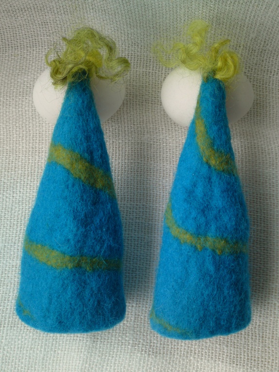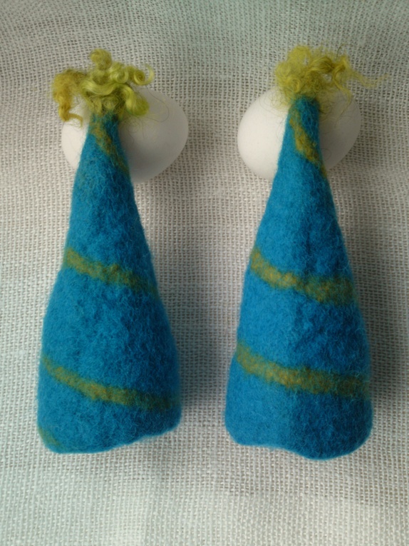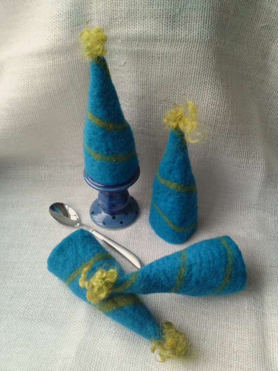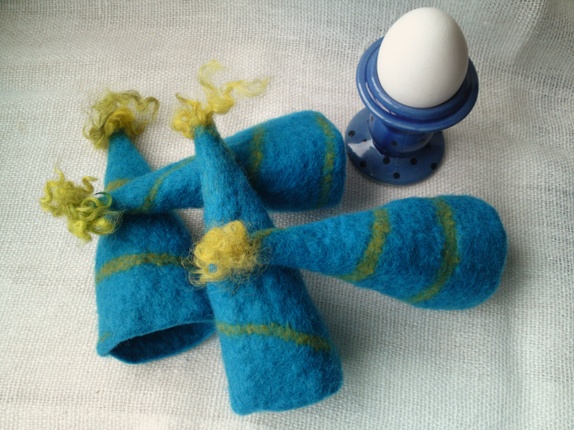 Fire håndtova fargesplæsjer holder eggene varme, og bordet pynta.