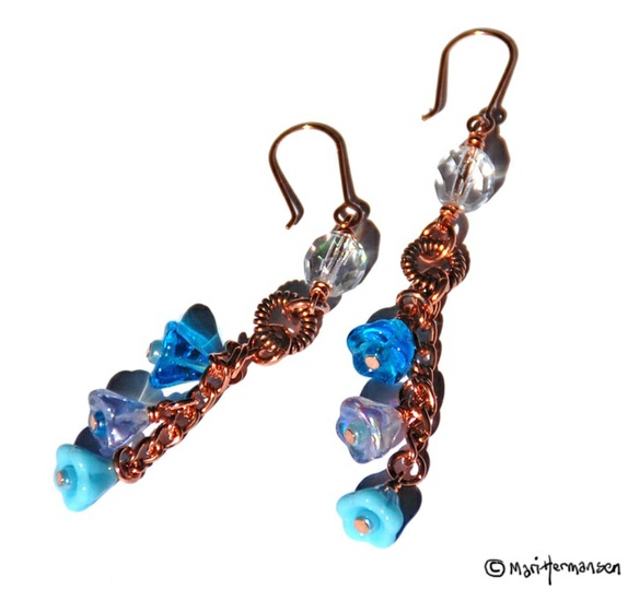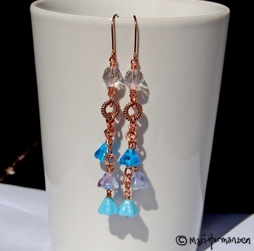 Flotte øredobber i kobber med fasetterte, tjekkiske glassperler og glassblomster.
