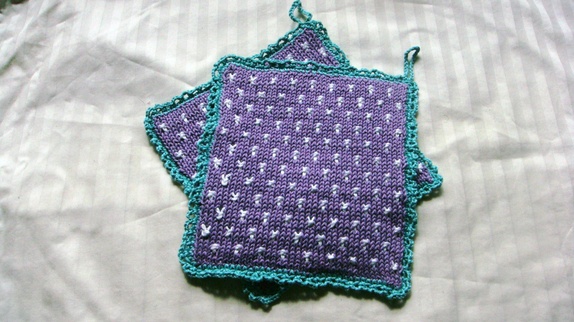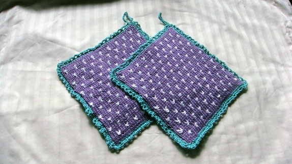 Håndstrikkede tykke og gode grytekluter i Gjestal sport bomull,med heklet kant .I fargene lilla,hvit og grønn. Målene er 19 x 20 cm. Kan vaskes i maskinen på 60 grader. Før 75,-