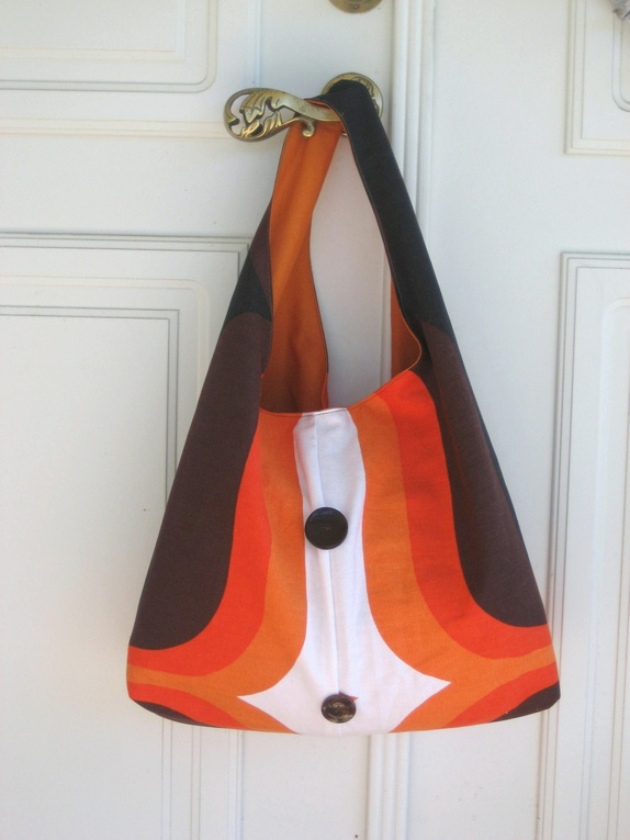Flott veske/nett sydd i retromønstret robust bomull, helfòret med orange bomull. Nettet er pyntet med 2 vintage knapper.