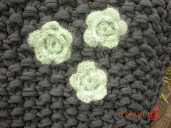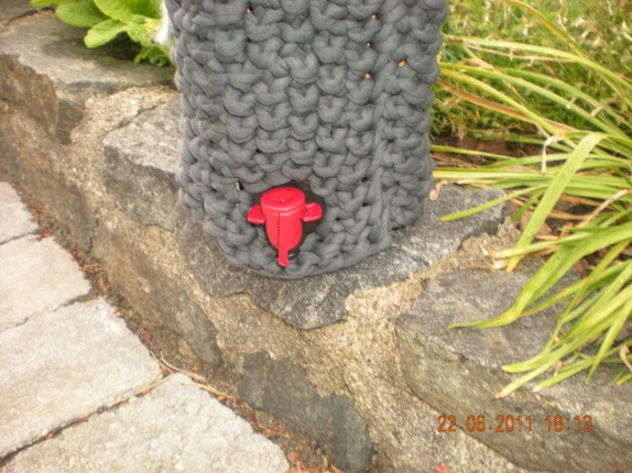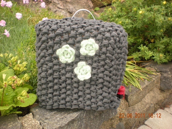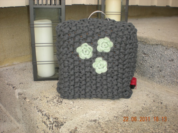 Trekk til vin kartong (3 liter) er strikket i overskuddstoffer. Trekket er pyntet med heklet blomster.
