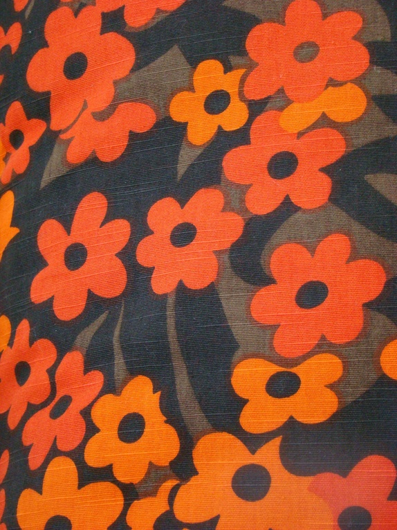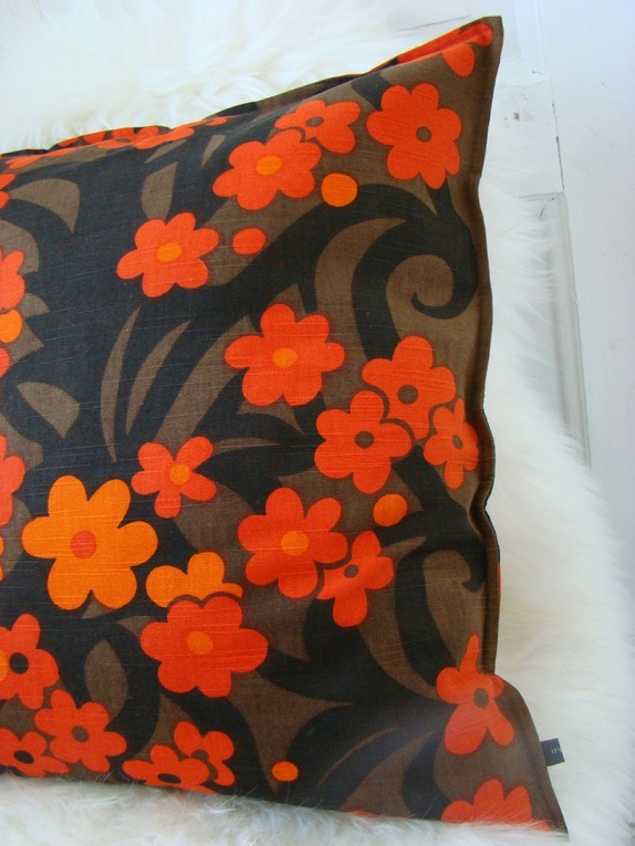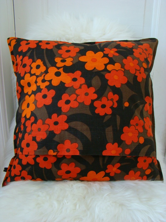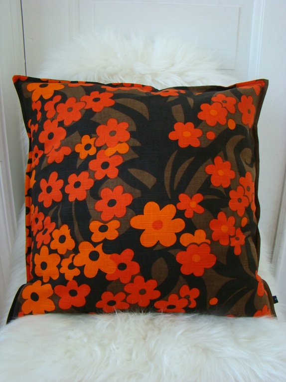 Pute sydd av bomullsstoff fra 70-tallet i brunt, oransje og svart. Bakside i samme stoff med konvoluttåpning. Pyntesøm i sidene.