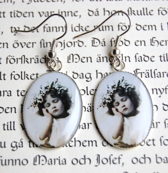 Et par sølvfargede øredobber.Epoxi på plate. Hele øredobben måler 4.4 cm.