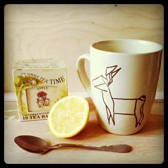 Lys beige porselenskopp med origamimotiv. Hjorten er håndtegnet av meg, inspirert av en brettet papirmodell :) Koppen tåler oppvaskmaskin.