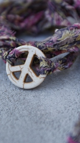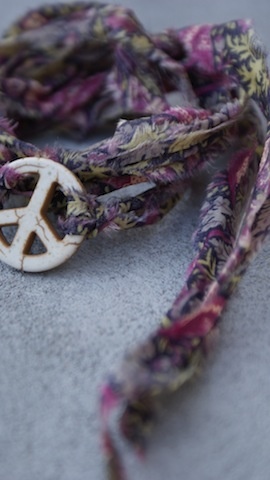 Peace tegn av ben i hvitt, diameter 2,5cm. Liberty tekstil ligger dobbelt og er 62 cm lang på HVER side.
