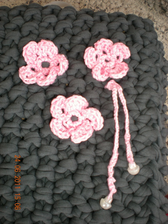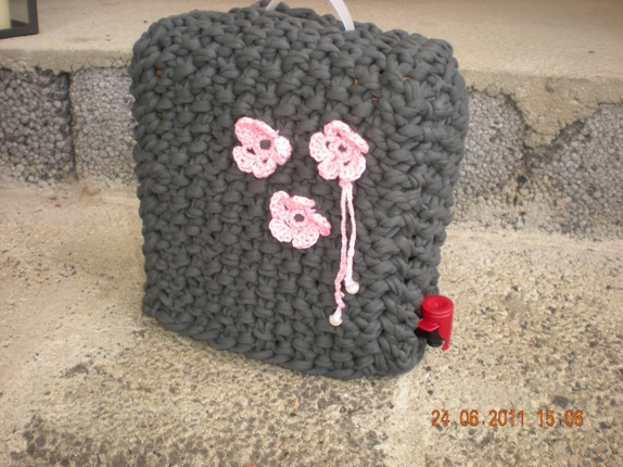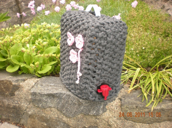 Trekk til vin kartong (3 liter) er strikket i overskuddstoffer. Trekket er pyntet med heklet blomster.