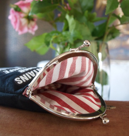 Portemone til penger etcsydd i sort bomullstoff med påstrøket motiv,foret med stripet bomull stoff.Vliselin mellom lageneHøyde: ca 12 cmBredde; ca 12 cm