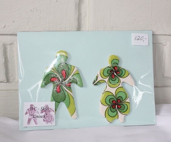 WC-skilt av fimoleire. Her kan både damer og herrer gjøre sitt ;)Kommer pakket inn i cellofan. En flott gave!