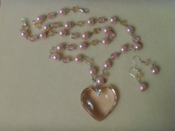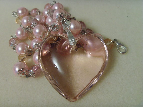 Kjedet er ca 72 cm langt og består av glassperler og krystaller i ulike rosa nyanser og størrelser. Hjerteanhenget er ca 4 cm stort. Låsen består av to karabinlåser, slik at man selv kan velge hvor langt kjedet skal være.