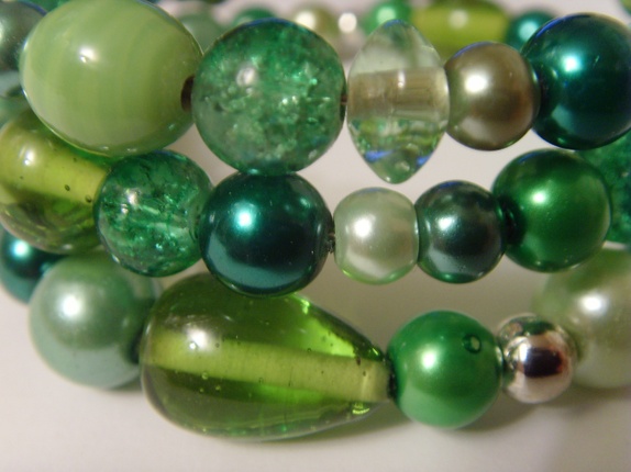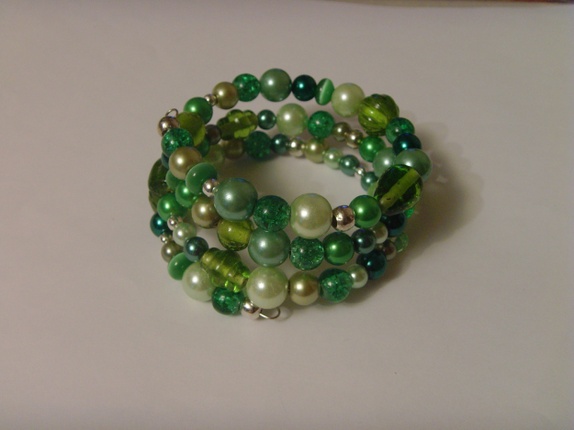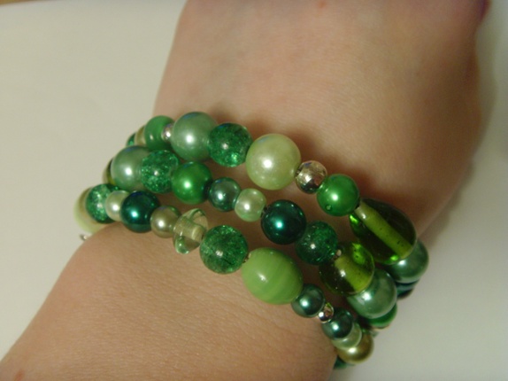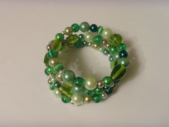Armbåndet består av 3 ringer med memorywire, med forskjellige glassperler og metallperler. Alt metall er nikkelfritt.