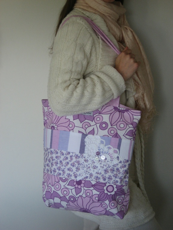 Handlenett/bærenett/veske i herlige retrostoffer i lilla og rosa, både nye og gjenbruksstoffer er brukt. Heklehjerte og vintage knapper til pynt på forsiden. Nettet har en innvendig lomme med en liten trykknapp. Det er fòret med et rosa mønstret bomullsstoff. Det er vrangsydd og har derfor ingen synlige sømkanter.