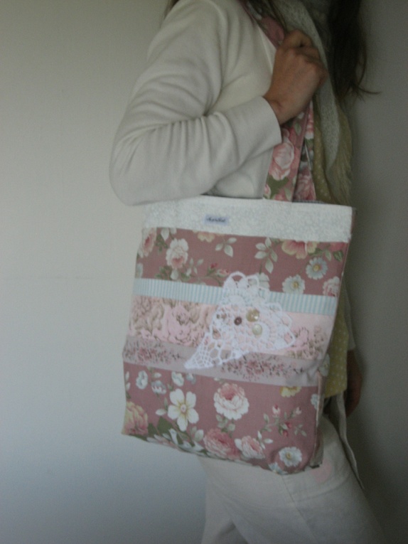 Handlenett/bærenett/veske i skjønne vintage stoffer i rosa, lyseblått og hvitt. Heklehjerte og vintage knapper til pynt på forsiden. Nettet har en innvendig lomme og er fòret med et hvitt og lyseblått stripet bomullsstoff. Det er vrangsydd og har derfor ingen synlige sømkanter.