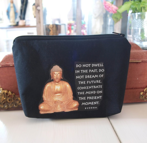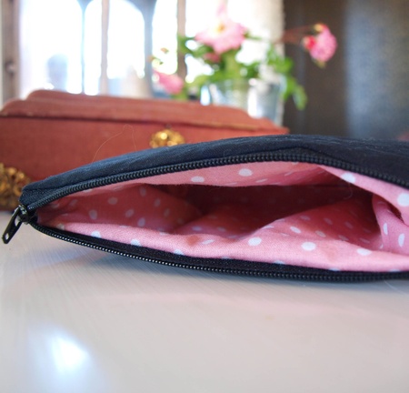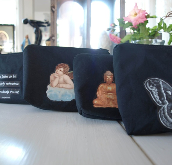 Veske til sminke, toalettsakereller det du måtte ønske.Sydd i sort bomullstoff med påstrøketmotiv .Foret med rosa polkadot stoff.Bredde:17 cmHøyde: 13 cm