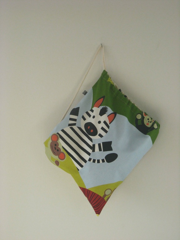 Fargerik, gammeldags gympose sydd i kraftig bomull. Posen har snørelukning med åpning på toppen. Motivet på denne posen er fra jungelen med en zebra, apekatter og andre jungeldyr...
