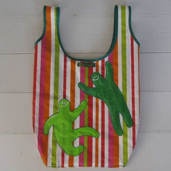 Sydd av stripete voksbelagt bomull i mange fine farger fra loppemarked. Langs hankene er det grønne skråbånd og bakpå God som Grønn-merkelapp.